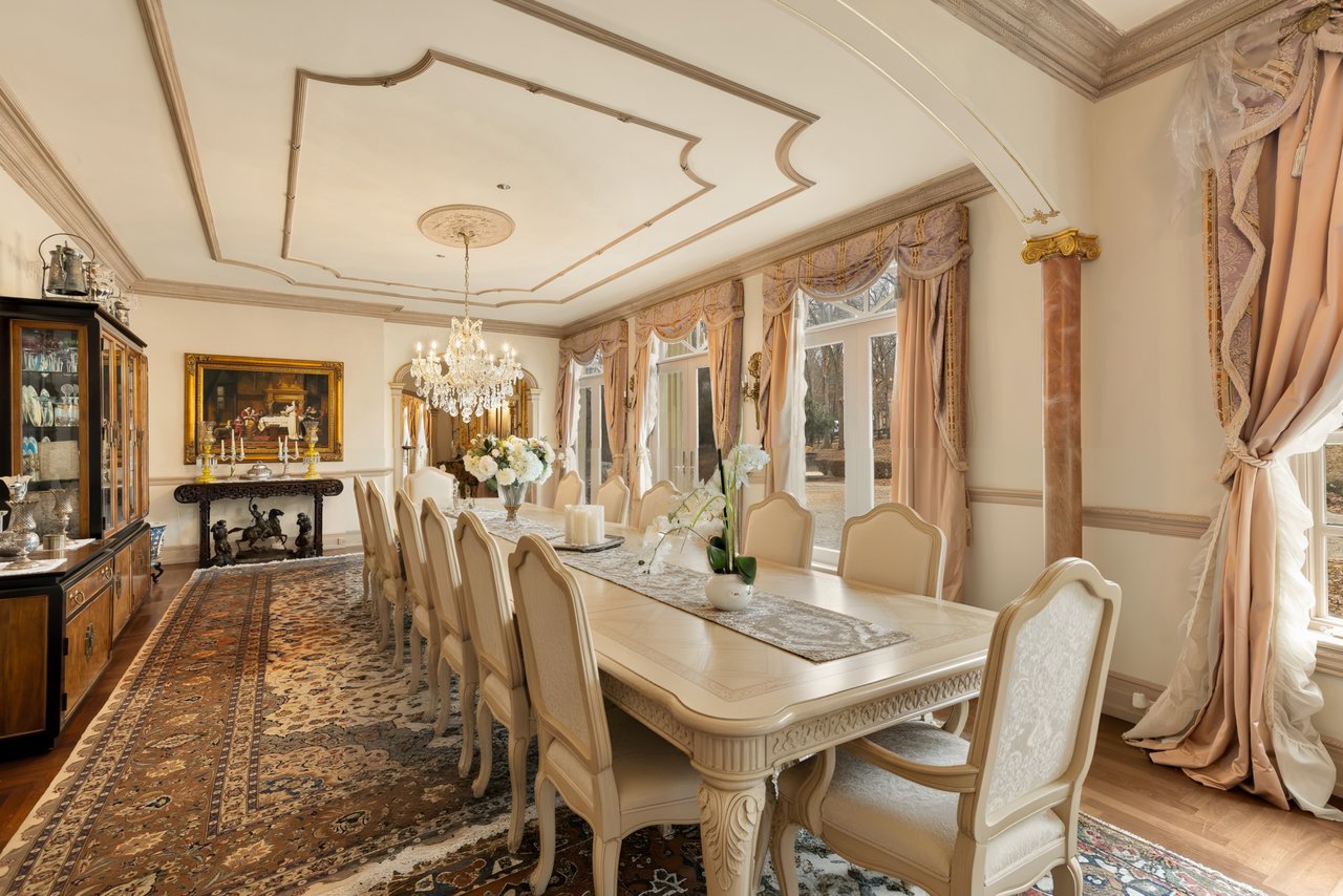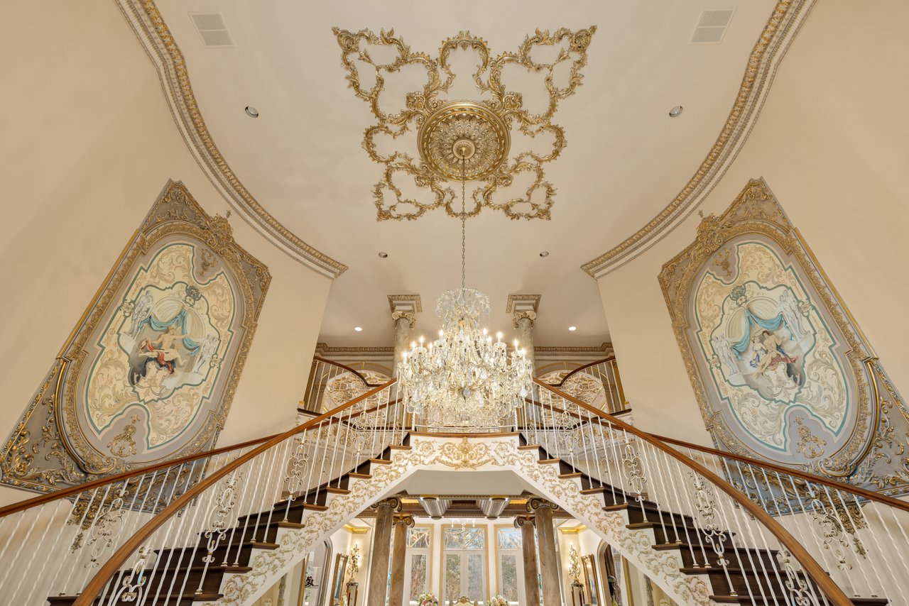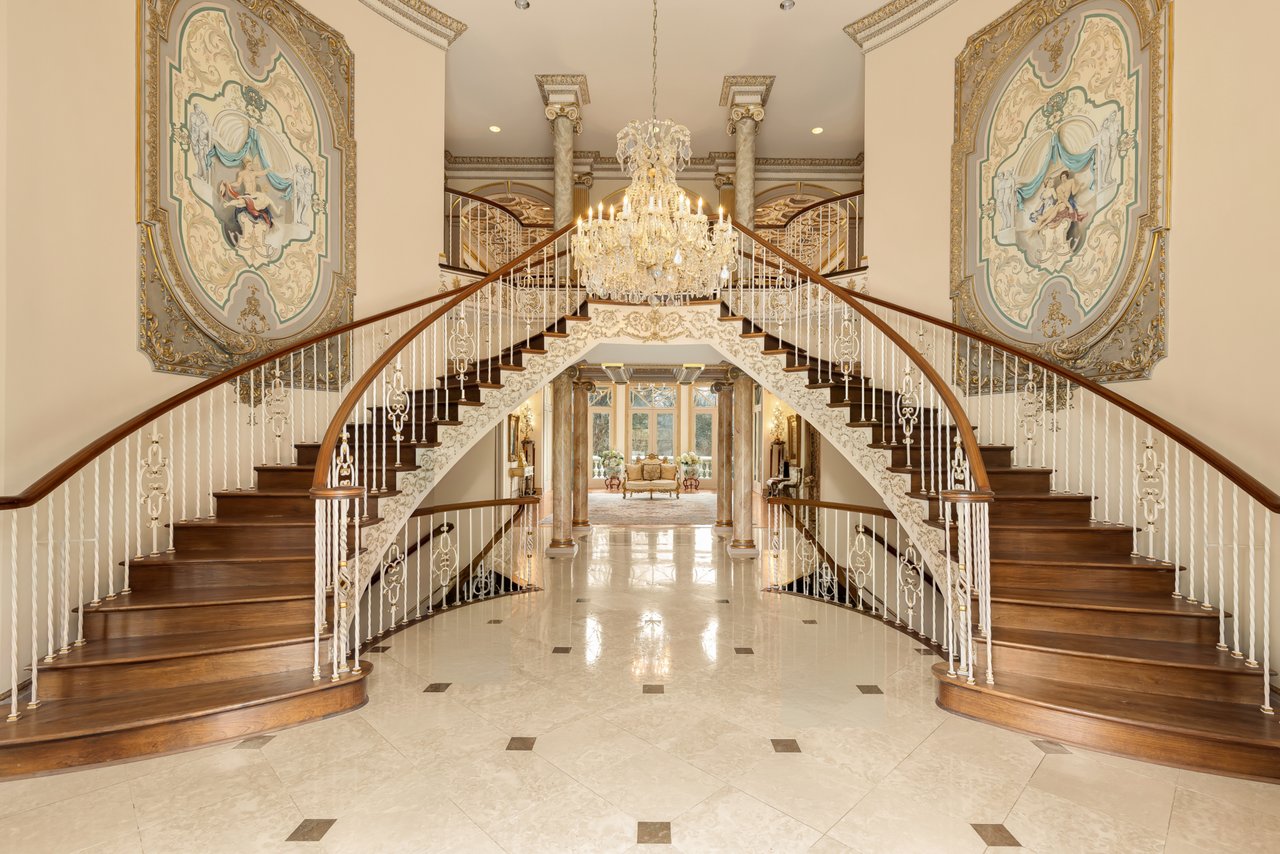 Double doors part to introduce a stunning foyer, framed by sweeping double staircases with a shimmering crystal chandelier overhead and classically inlaid marble floors beneath. An expansive floor plan spans over 17,000 square feet of exquisitely detailed living space. Formal living and dining rooms flank the entryway in a traditional center hall configuration. The former features a fireplace and flows into a dignified study, lined with a curved wall of windows and rich built-ins. Both spaces showcase intricate millwork and parquet flooring.